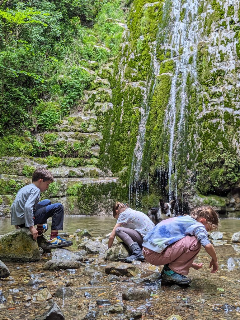 Lo que más les flipó, en palabras de Carmen. El agua transparente, el color esmeralda, las piedras redondeadas por el río, las cascadas que parecen de cuento… y hasta las ranas croando de fondo. Un baño sin cloro, sin socorrista, sin flotadores de unicornio. Solo ellos, el río y la aventura.
