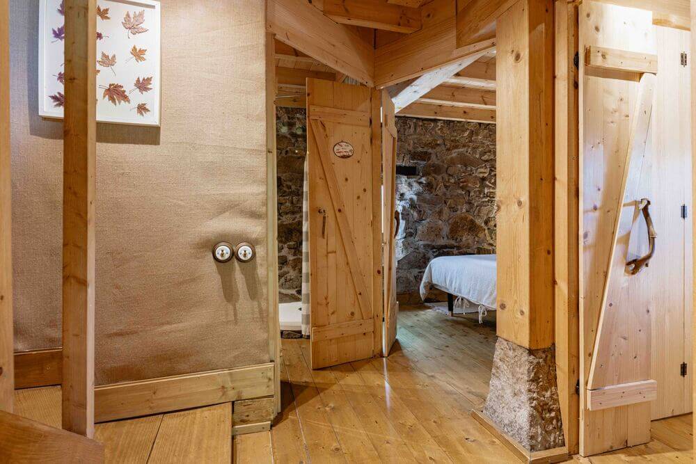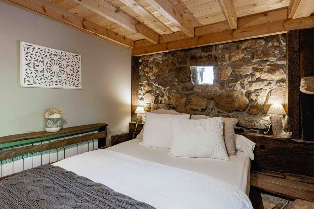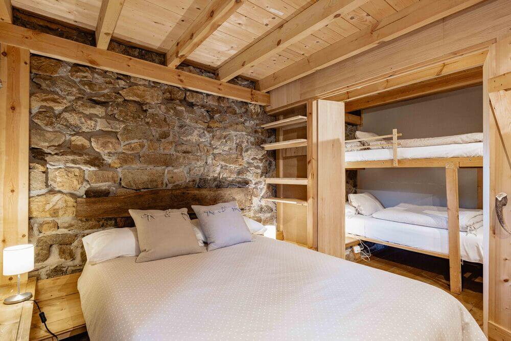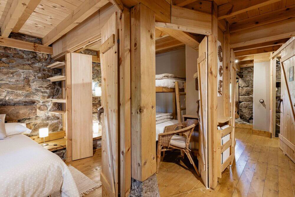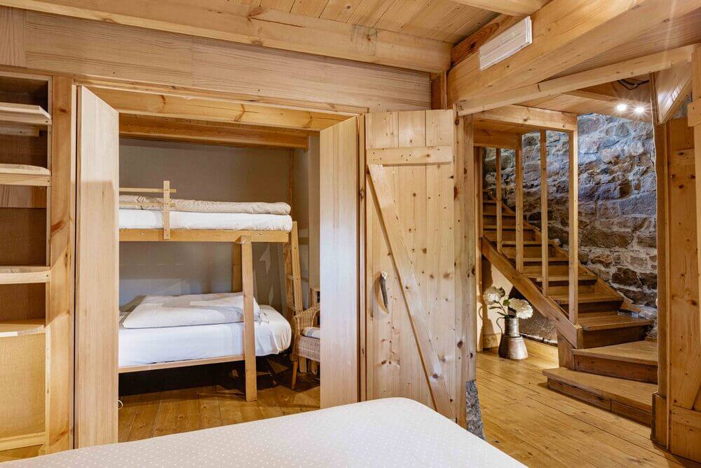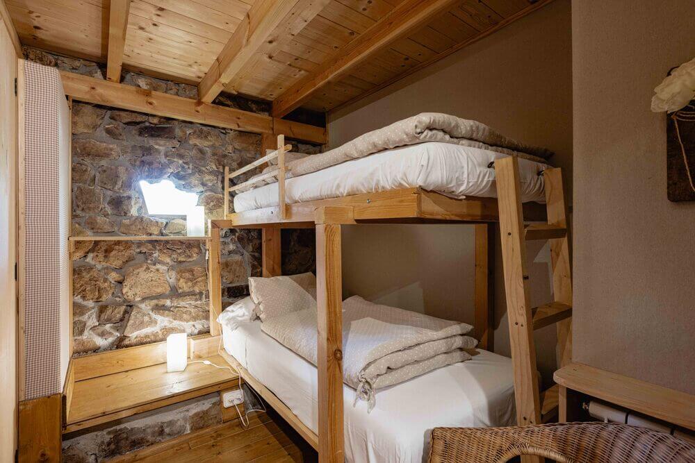 Un dormitorio secundario, con dos camas dobles unidas de 90 cm. y una litera con dos camas individuales de 90 cm. (Estos dos espacios se pueden unir o separar con una puerta corredera haciendo dos habitaciones independientes).