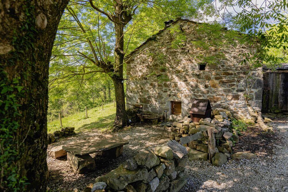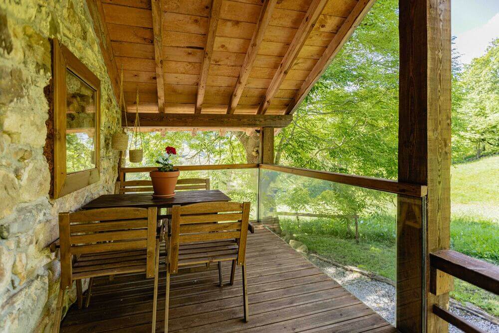 Terraza privada bajo la sombra de un gran fresno, ideal para relajarse.